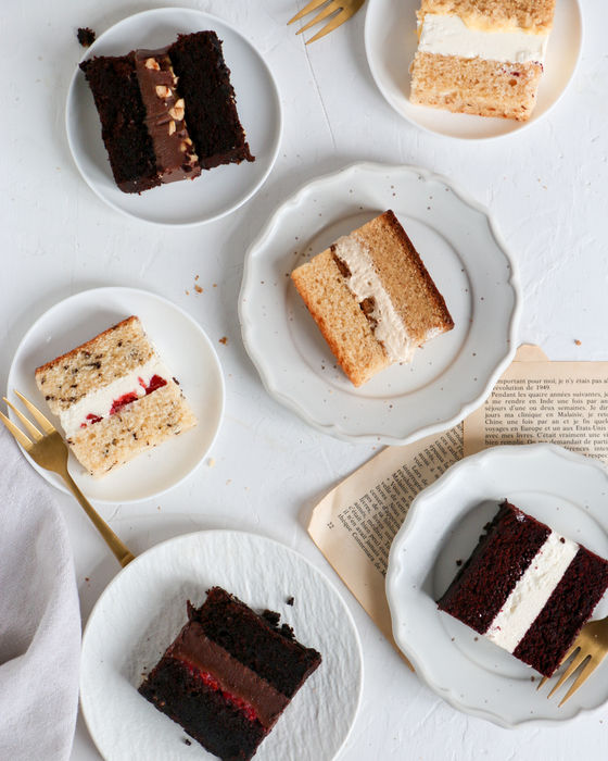 4. Pour un même gâteau, vous avez la possibilité de choisir plusieurs goûts et/ou garnitures en fonction de sa taille, c’est-à-dire en fonction du nombre d’étages. Vous pourriez donc choisir jusque deux combinaisons pour un gâteau à deux étages, et trois pour un gâteau de trois étages. Êtes-vous intéressés à tester des échantillons ? Visitez notre site et ne ratez pas notre « Cake Sample Box » : trois à quatre fois par an, nous offrons la possibilité de goûter jusqu’à six combinaisons de goûts différentes.